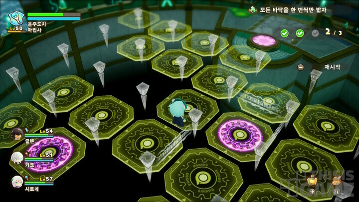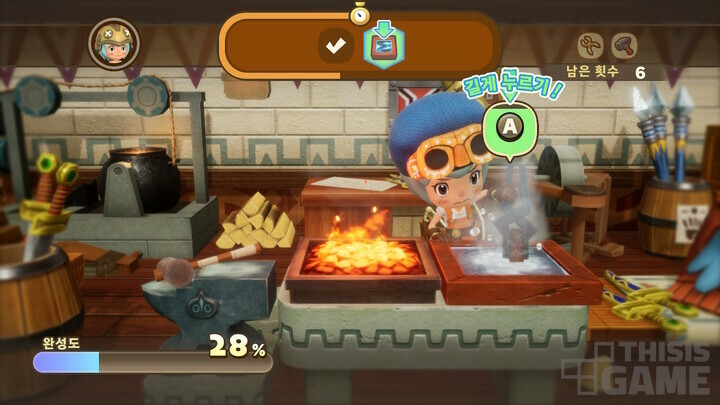그런데 웬일인가. 제작에 등장하는 미니게임이 귀여운 동시에 꽤 긴장감 있고 재밌어서 가장 매력적이라 느껴졌다. <붕어빵 타이쿤> 같은 게임을 스피드런으로 플레이하는 느낌이랄까. 3개의 기물 사이를 오가며 탭, 길게 누르기, 연타를 주문대로 수행하는 단순한 방식인데 묘하게 중독적이다. 높은 단계로 클리어하면 제작된 아이템에 좋은 특성이 추가로 부여되거나, 제작되는 아이템 개수가 늘어나는 방식으로 보상도 확실히 준다.