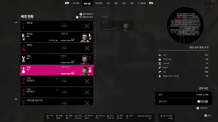 시설에 직접 가지 않아도 메뉴에서 얼터들의 작업 배정과, 각 시설의 작업 현황을 관리할 수 있다.