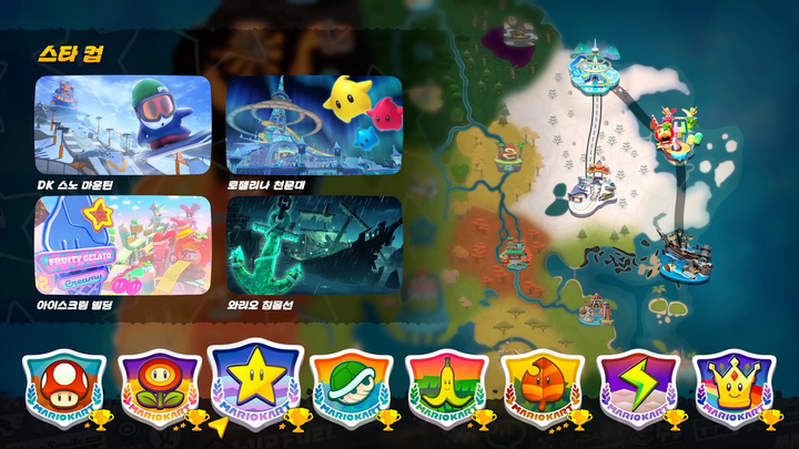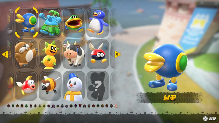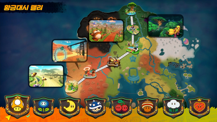 '데이지'와 '쿠파주니어' 등의 주요 드라이버 캐릭터는 그랑프리를 완주해서 해금하고, 다른 캐릭터들은 주행 중 마귀 아이템의 효과로 얻게 되기도 하죠. 이 캐릭터들의 스킨인 코스튬은 앞서 소개한 대시푸드로 변신해 획득할 수 있습니다. 한 번 변신을 하고 나면 캐릭터 선택창에서 고를 수 있게 되고요. 코스튬을 얻을 수 있는 캐릭터와 수집 현황은 캐릭터 선택 메뉴의 실루엣으로도 짐작할 수 있지만 맵에서 정확하게 확인할 수 있습니다.