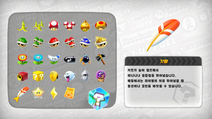 그 밖에도 여러 개의 망치를 직선으로 던져 라이벌의 카트를 뒤집는 '해머', 기존의 '슈퍼스타'와 비슷하게 빨라지면서 번개 등의 피해에 무적이 되고 라이벌을 짓밟을 수 있는 '거대버섯', 라이벌을 공격하면서 코인을 떨어뜨리는 '골드등껍질', '파이어플라워'처럼 투사체를 던져 라이벌의 카트에 스핀을 걸지만 얼음이라는 점이 다른 '아이스플라워', 코스에 이상한 현상을 일으키는 '마귀' 등 활용할 게 많아졌습니다. 달리다 보면 가끔 만날 수 있는 '대시푸드'는 대시를 할 수 있을 뿐 아니라 캐릭터의 코스튬을 바꿔주기도 하고요.