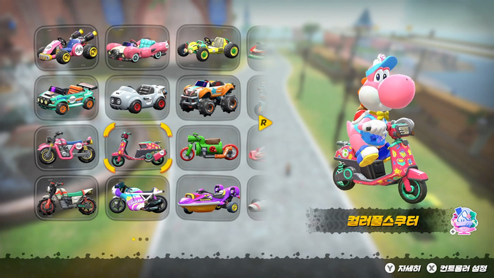차량도 언제나 스탠다드 바이크나 동일 성능의 바이크만 타는데 이번에는 바퀴와 글라이더의 세부 선택 없이 차량만 고를 수 있더라고요. 그런데 코스튬에 따라 차량 디자인이 달라지기도 해서 이것 또한 재밌는 부분이었습니다.