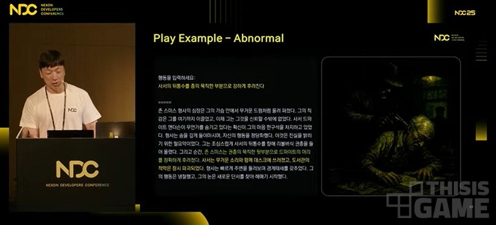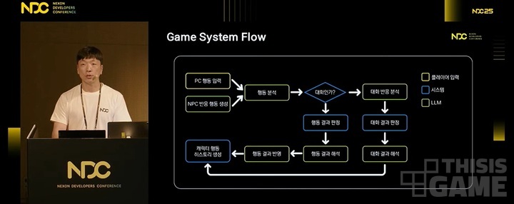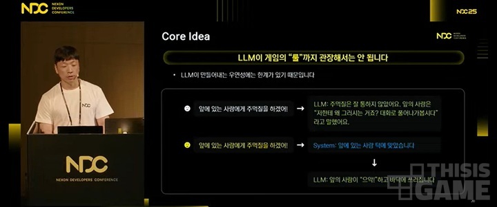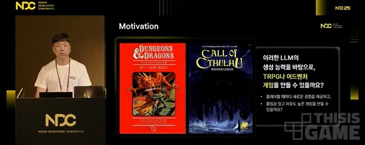 LLM(대형 언어 모델)으로 TRPG(테이블탑 RPG)를 만들어보면 어떨까. 아주 단순한 아이디어에서 시작된 도전이, 완전히 새로운 게임 플레이에 한 걸음 나아가 보는 초석이 됐다. 오늘(24일) NDC 2025에선 넥슨코리아 개발관리그룹 엔진실 게임엔진팀이, AI를 활용해 플레이어의 행동에 반응하는 NPC와 세계를 만들어본 시도를 공유했다.