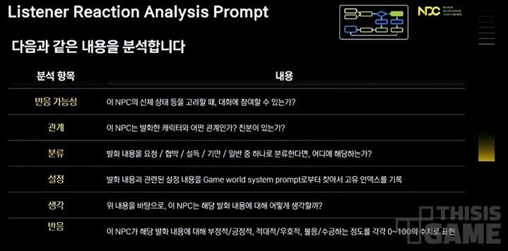 그래서 넥슨이 시도한 방식은 LLM으로 AI 에이전트 NPC를 만드는 방향이었다. 앞서 스탠포드 대학에서도 비슷한 연구 사례가 있었고, 크래프톤의 <PUBG>나 <인조이>에도 AI 에이전트 도입이 있었는데, 여기서 핵심은 '자연스러운 반응 행동'을 만들기 위해 '판단하고 계획하는 단계'가 선행된다는 점이다. 대신 그만큼 필요한 연산량과 처리 비용 및 처리에 필요한 시간이 증가한다는 단점은 존재한다.