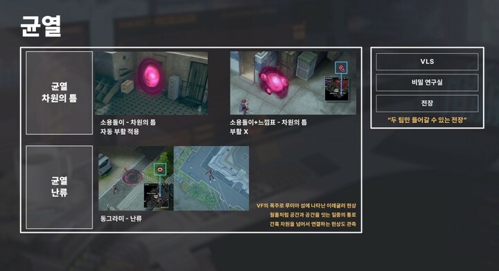 Q. 균열은 이전에 존재했던 전장과 비슷한 시스템이다. 전장의 문제점은 여러 팀이 몰려 3팀 이상이 하나의 전장에서 싸우는 경우가 있었다는 것이었는데, 균열은 두 팀만 들어갈 수 있기에 그런 문제가 적을 것으로 보인다. 균열의 기획 의도를 조금 더 자세히 설명해 달라.