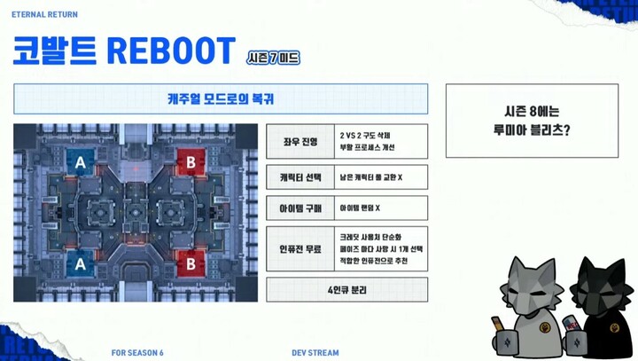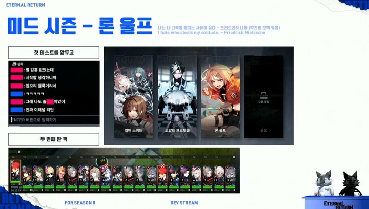 A. 이리 1 디렉터: 론 울프는 코발트 프로토콜처럼 '캐릭터별 모드 보정치'만 적용된다. 아무래도 특정 모드를 위한 스킬 재작업은 많은 리소스가 투입되기에 수요와 공급의 법칙으로 중요하다고 보시면 된다. 만약 그 모드의 수요가 엄청나게 커진다면, 당연히 그 모드만을 위한 개발력 투자를 할 수 있을 것이다. 시즌 8에서 론 울프는 2시간 정도씩만 운영되는 이벤트 모드기에 보정치만으로 운영될 것이다.