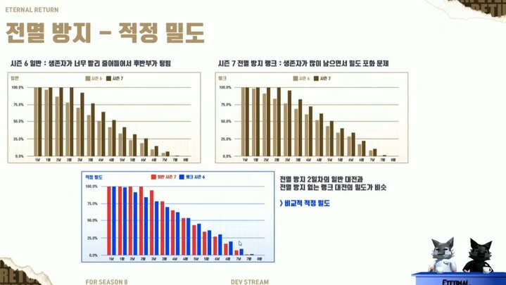 A. 이리 1 디렉터: 일단 저희가 생각하는 기조가 하나 있다. 나쁜 변화가 아무것도 없는 것보다는 낫다. 시즌 2가 그랬다. 최근 다른 게임의 사례를 참고해 봐도 뚜렷하다. 한 시즌에서 큰 변화를 줘 좋은 성과를 냈는데, 다음 시즌에서는 변화를 적게 줘서 아쉬운 결과를 보이는 것이다.