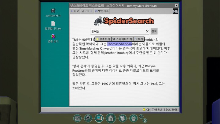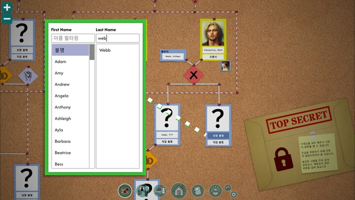 게임이 진행되면서 도서관이나 간행물 같은 새로운 검색 도구가 추가되고, 각 자료와 가계도의 연관성도 직관적으로 표시된다. 스파이더서치 검색 결과 말미에는 가계도 복원과의 관련성을 암시하는 주석이 달려 있는데, 현실의 인터넷 환경에서는 볼 수 없는 요소라는 점에서 게임적 장치로 이해하는 것이 적절하다.