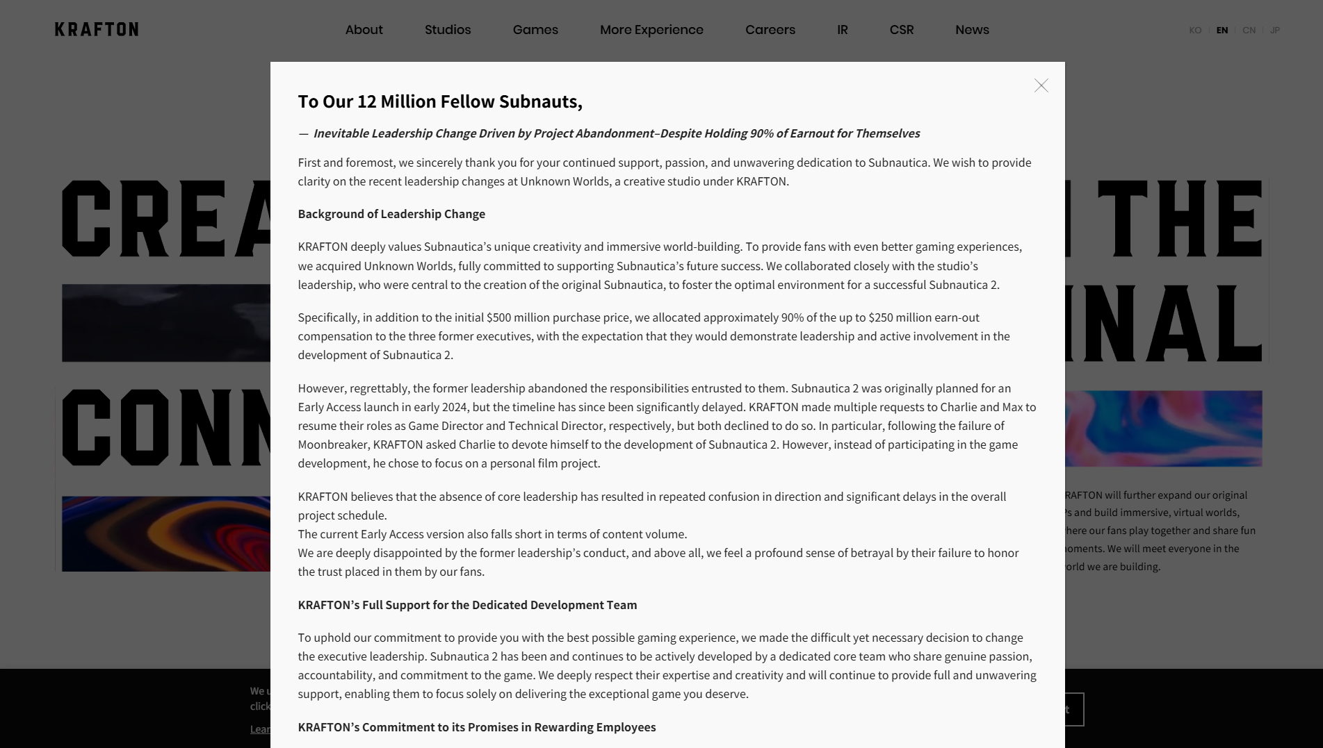 크래프톤에 따르면, 회사는 2019년 언노운 월즈를 5억 달러에 인수한 후 전 경영진 3명에게 추가로 약 2억 5천만 달러의 수익 보상을 약속했다. 이는 그들이 <서브노티카 2> 개발에 지속적으로 참여할 것이라는 전제하에 이뤄진 조치였다는 것이다.