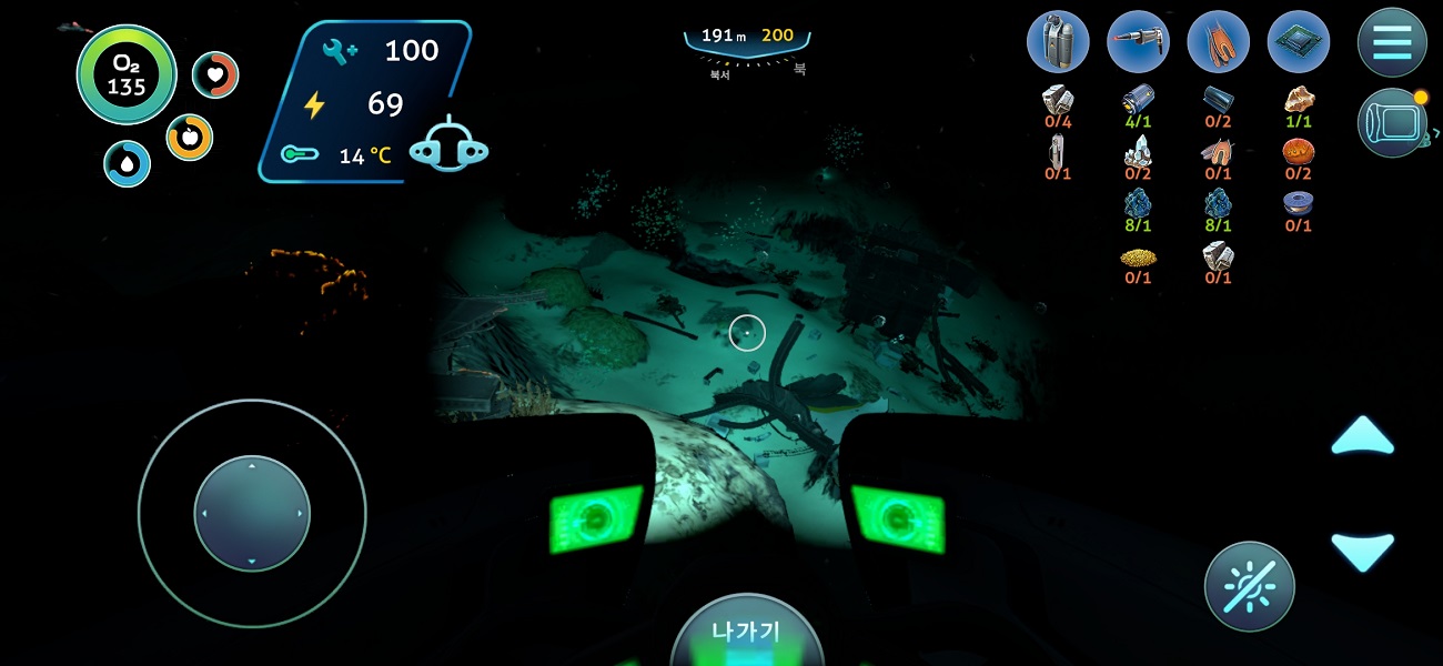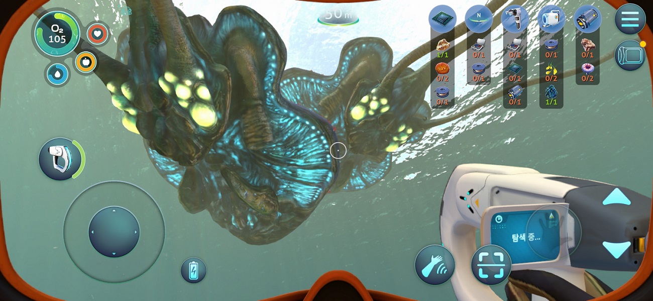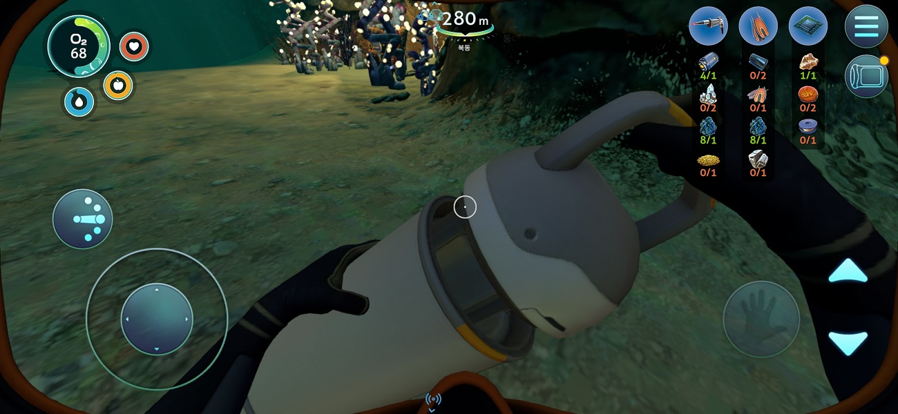 시야 이야길 해보자. 아무래도 화면이 훨씬 크고 선명한 PC에 비해 모바일에선 시야가 다소 제한될 수밖에 없다. 가장 많은 불편을 겪은 건 리튬이나 다이아 같은 광물을 찾을 때였다. 어두운 바다에서 아무리 조명을 켜고 다녀도, 원작에서도 일반 지형과 구분하려면 뚫어져라 봐야 했던 암석들이 모바일에서 눈에 잘 들어올리 만무하다.