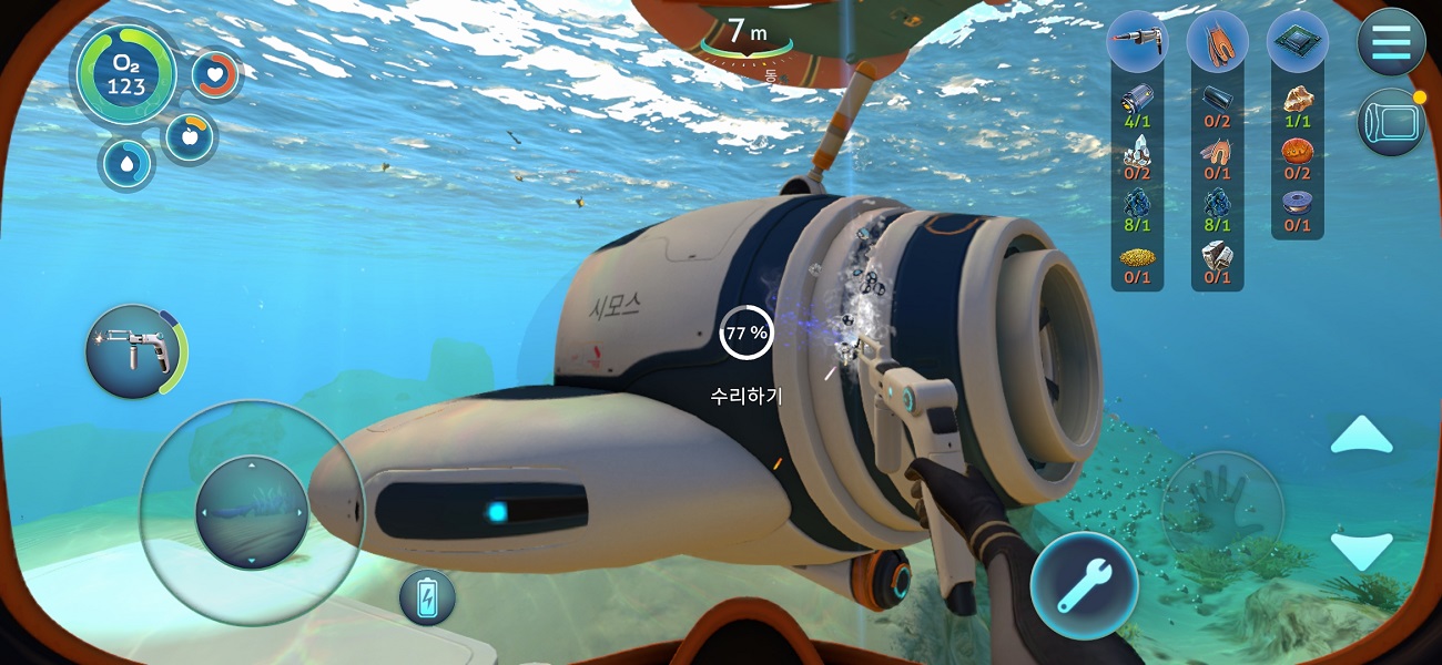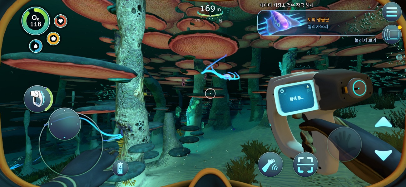 그렇게 조금 너그럽게 생각해보면 이 정도 비주얼까지 끊김 현상 없이 옮겨온 것만 해도 대단한 것이긴 하다. 비주얼에 대한 만족감은 모바일이라는 점을 감안하면 나쁘지 않은 편이었다. 바로 옆에 PC, 콘솔 버전을 두고 비교하면 역체감이 되기야 하겠지만, 모바일에서 <서브노티카>를 즐길 수 있게 한다는 기획 및 출시 의도 자체엔 충분히 부합하는 그래픽이다.