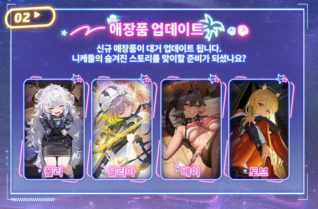 이번 업데이트를 통해 ‘폴리’, ‘토브’, ‘율리아’, ‘베이’의 애장품과 전용 월페이퍼가 추가된다. 파견과 솔로레이드에서 해당 니케의 애장품 재료를 획득할 수 있으며 마일리지 상점에서 애장품이 추가된 니케와 해당 니케의 스페어 바디를 각각 골드, 실버 마일리지 티켓으로 얻을 수 있다.