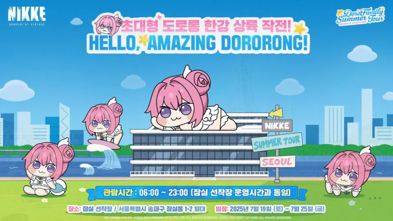 이번 인게임 업데이트에 예고된 도로시의 등장과 함께 오프라인에서는 여름을 맞아 니케의 마스코트 ‘도로롱’이 여름 비키니를 입고 전 세계에 등장할 예정이다. 뉴욕, 오사카, 서울, 타이페이, 방콕 등 5개 도시의 랜드마크에서 진행되는 글로벌 이벤트 ‘DoroFamily Summer Tour’를 통해 ‘도로롱’을 포함한 나머지 DORO 일원인 ‘일레롱, 라피롱, 아니롱, 네로롱’도 함께 깜짝 등장할 예정이며, 국내에서는 초대형 도로롱 풍선의 ‘한강 상륙 작전’이 이달 19일부터 잠실 선착장과 그 일대에서 진행될 예정이다.