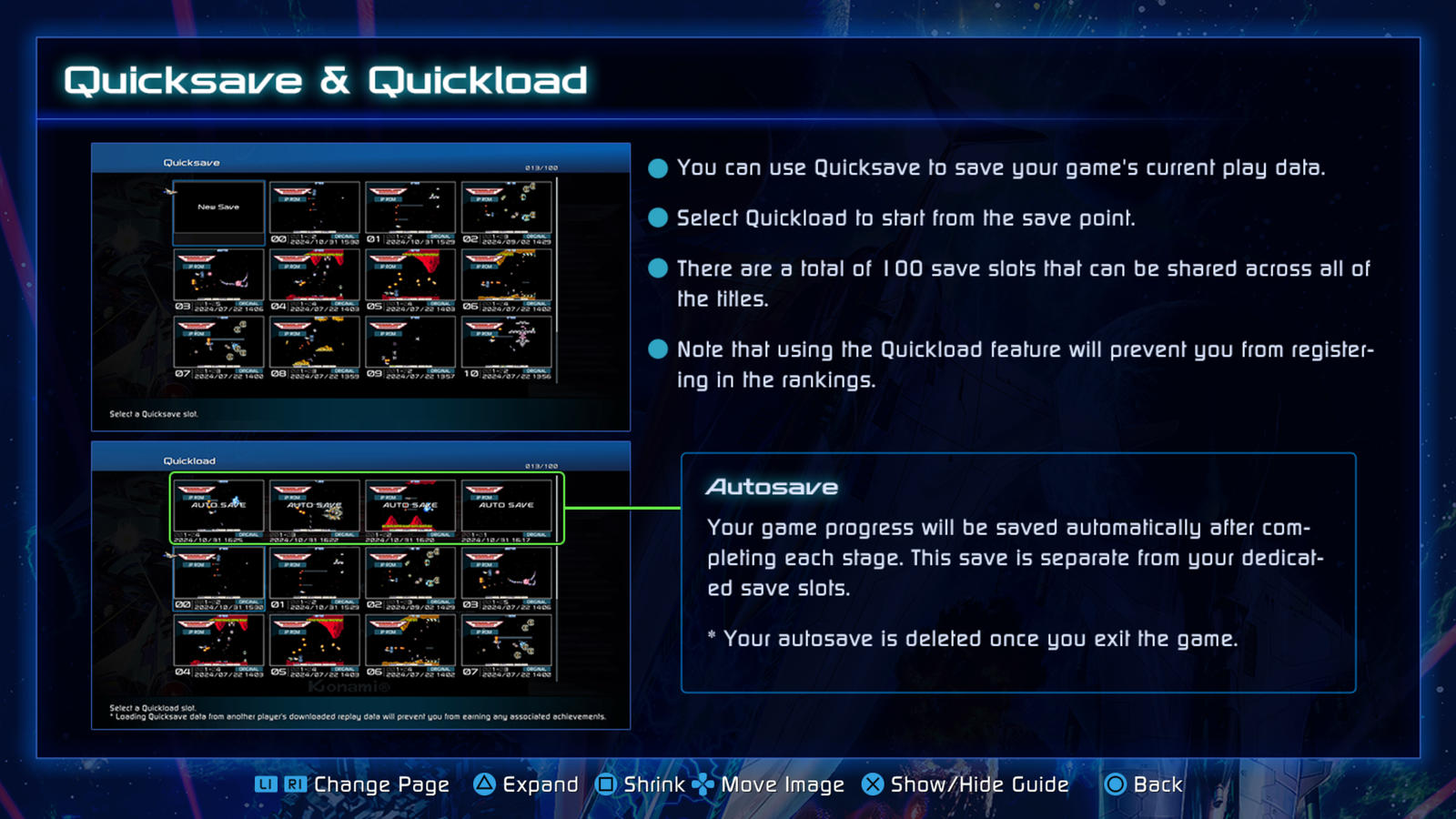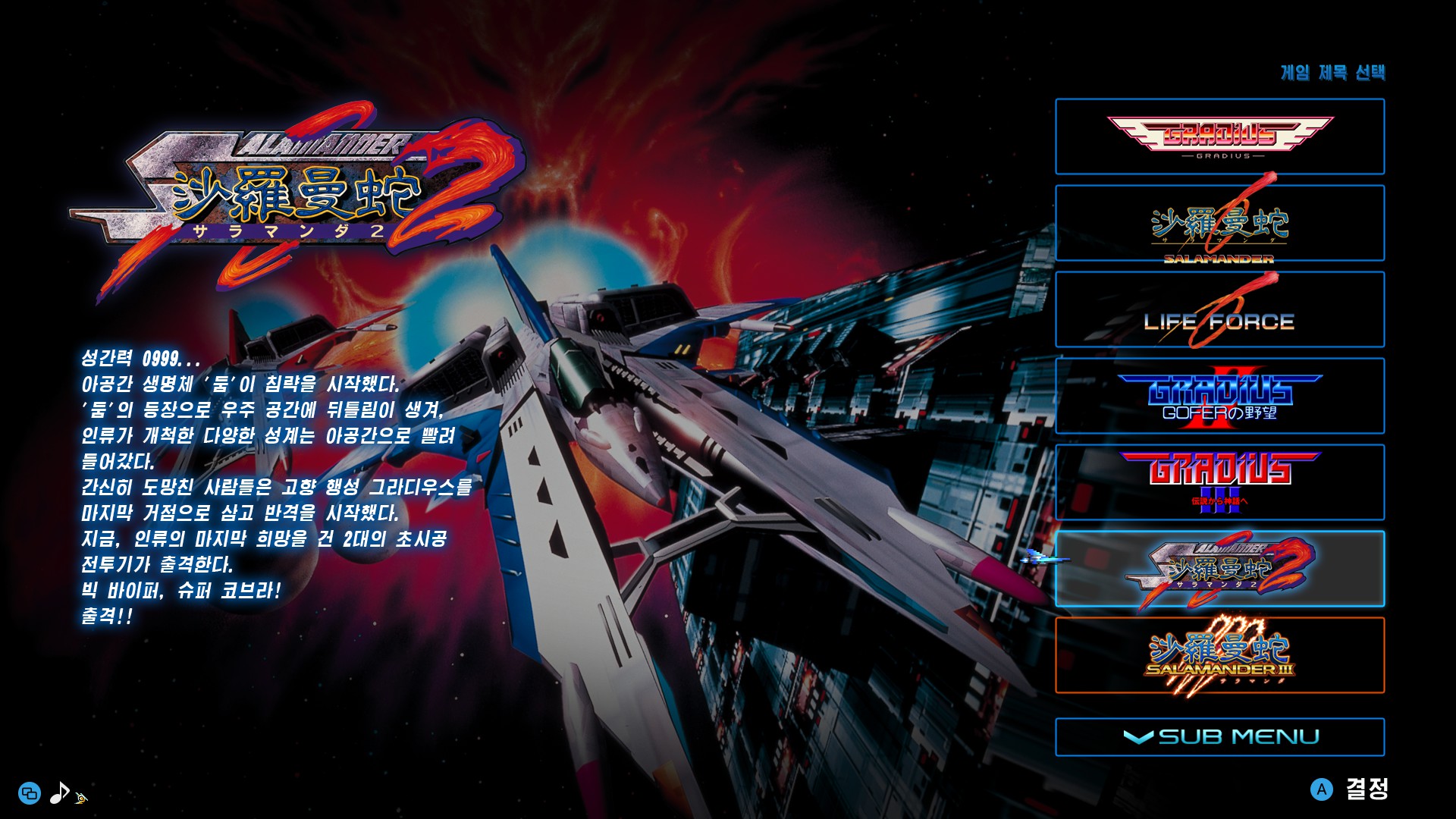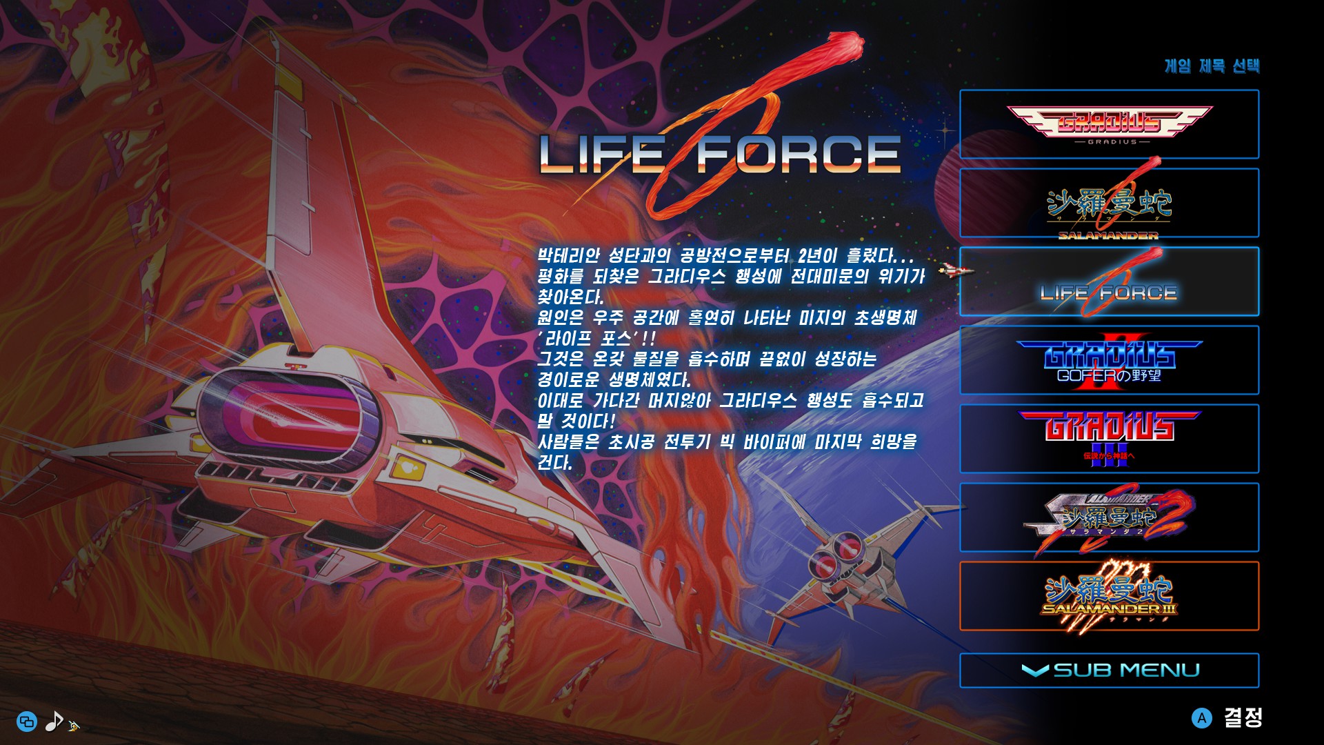 지금까지 <그라디우스> 시리즈, <사라만다> 시리즈의 타이틀은 여러 번 콘솔로 이식되어 왔지만, 이번에는 지원 기능이 풍부하게 탑재되어 있어, 이전 타이틀을 소지하고 있어도 새로운 체험을 즐길 수 있는 결정판이 되었습니다.
