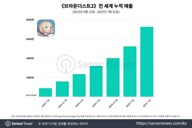 2025년 1월 1일부터 7월 31일까지의 집계에서, <브라운더스트 2>는 모바일 턴제 RPG 매출 성장 기준 글로벌 9위를 기록했다. 출시 2주년 이벤트의 힘이 그만큼 강력했던 것이다.