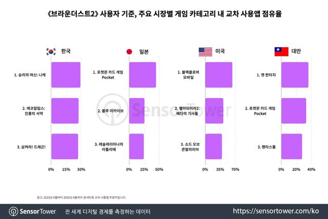 이 교차 사용앱 점유율 집계는 2023년 6월부터 2025년 6월까지의 데이터를 기반으로 하고 있는데, 한국에서 <브라운더스트 2> 유저들은 <승리의 여신: 니케>, <에코칼립스: 진홍의 서약>, <삼켜라 드래곤>을 함께 즐긴 사람들이 많았다. 일본에선 <포켓몬 카드게임 Pocket>, <블루 아카이브>, <레슬레리아나의 아틀리에>를 함께 즐겼다.