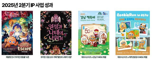 특히 2025년 2분기에는 체험형 전시 ‘쿠키런 방탈출’, <쿠키런: 킹덤> 성수 카페 ‘열정과 나태의 낙원’ 전시를 진행해 호평을 받았고, 강남구, 제주관광공사와 MOU를 체결하면서 ‘강남 책축제’, ‘쿠키런과 함께하는 제주 여행 주간’ 등을 선보이기도 했다.