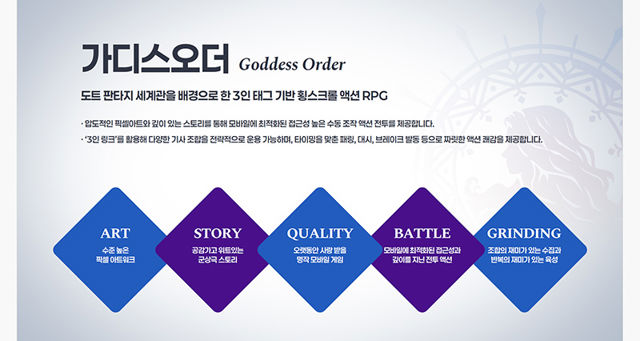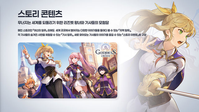 게임은 메인 스토리르 다룬 '여신의 임무' 외에도 세계 곳곳에서 벌어지는 다양한 이야기들을 볼 수 있는 '지역 임무', 각 캐릭터(기사) 들의 숨겨진 이야기를 볼 수 있는 '기사 임무' 등 여러 스토리 콘텐츠를 촘촘하게 선보일 예정이다.