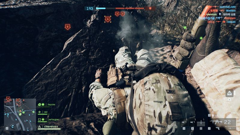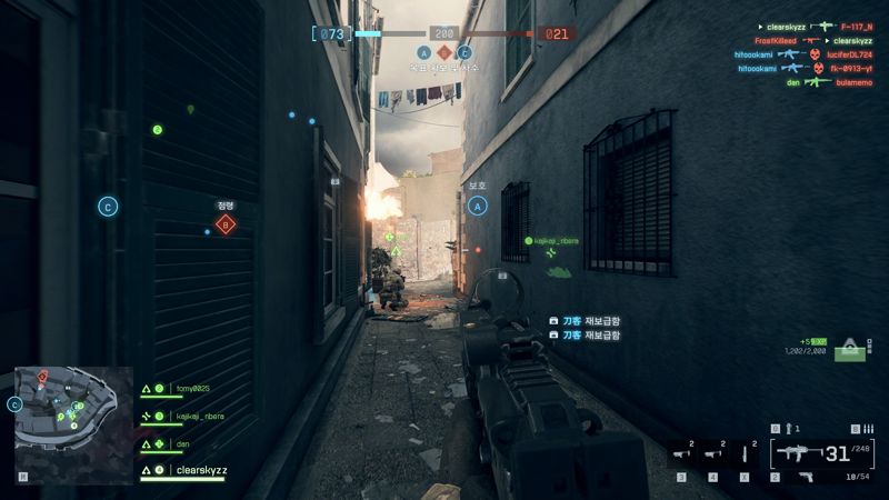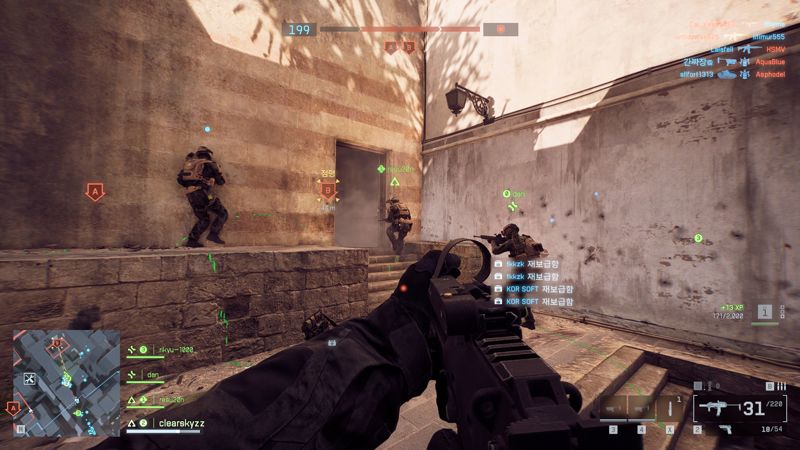 그 외에도 교전의 재미를 주는 긍정적인 변화가 있다. 본작에 추가된, 지금까지 수많은 <배틀필드> 팬들이 바래 마지않았던 '아군을 끌고 가면서 소생시키는' 기능은 게임에서 정말 잘 동작한다. 아무래도 코너 교전이 많은데, 위험한 위치에 쓰러진 아군을 코너를 돌아 보이지 않는 각으로 끌고 가면서 소생시키는 상황이 정말로 자주 나오기 때문. 보병이 포복하는 경우에도 <배틀필드 V>처럼 앞뒤로 자세를 바꾸면서 사격할 수 있는데 덕분에 포복한 상태에서도 조작감이 매우 쾌적하다. 적의 후미에 도는 상황이라면, 발소리가 조금 덜 들리도록 앉은 상태에서 달리며 이동할 수 있기도 하다.