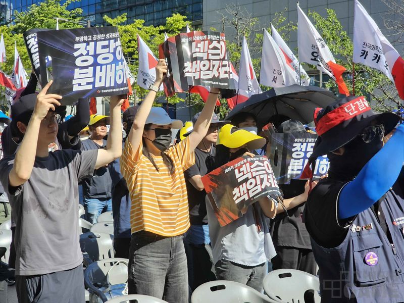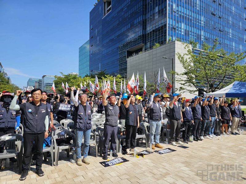 결의에 참여한 노조 연대는 구호를 외치며 넥슨코리아 사옥 앞을 행진하고 투쟁을 이어가겠다는 입장을 밝혔다.