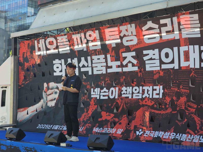 12일, 판교 넥슨코리아 사옥 앞에서 '네오플 파업 투쟁 승리를 위한 화섬식품노조 결의대회'가 열렸다. 네오플 노동조합 '네오플 분회'가 공정하고 투명한 성과급 분배 제도의 도입과 보상 체계 공개를 이유로 전면 파업에 돌입한 지 49일째다.