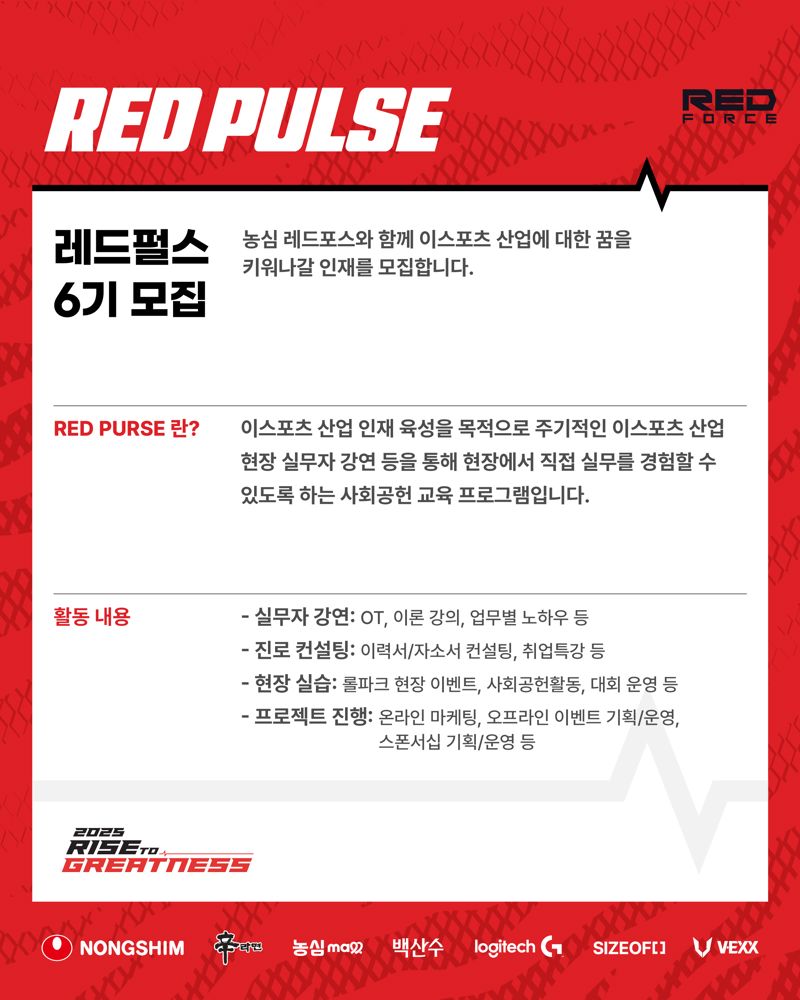 레드펄스 6기는 총 15명을 선발할 계획이며, 선발된 참가자들은 온라인 SNS 마케팅부터 온·오프라인 이벤트 운영 기획 및 계획 수립 등 이스포츠 마케터가 되기 위해 실질적으로 도움이 되는 실무 교육을 받는다. 이 과정은 스포츠와 이스포츠 분야를 모두 경험한 전문 멘토단이 지도한다.