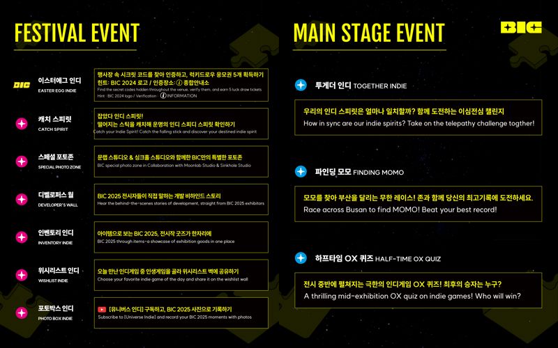 게임도시 부산광역시(시장 박형준), (재)부산정보산업진흥원(원장 김태열), (사)부산인디커넥트페스티벌조직위원회(조직위원장 주성필, 이하 BIC 조직위)는 오는 8월 15일(금)부터 17일(일)까지 개최되는 ‘부산인디커넥트페스티벌 2025(BIC Festival 2025, 이하 BIC 2025)’ 오프라인 페스티벌의 주요 현장 이벤트를 공개했다.