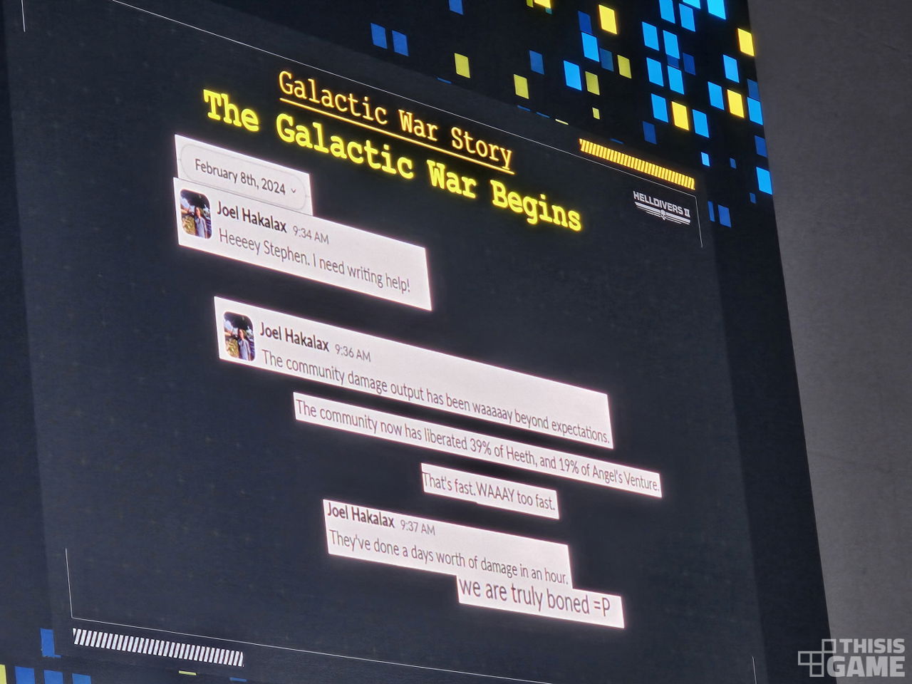 하지만, <헬다이버즈 2>는 애로우헤드의 예상을 아득히 넘어서는 흥행을 달성했다. 당연히 플레이어가 주요 명령을 완수하는 속도는 계획보다 약 10배 이상 빨랐다. 출시 하루 만에 게임 마스터인 조엘은 스테판에게 급하게 스토리 부분에서 도움이 필요하다는 메시지를 보냈고, 결론은 간단했다. “우린 망했다.” 실제로 조엘이 당시 메신저를 통해 보냈던 메시지다.
