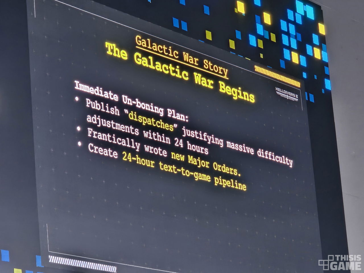 이를 위해 24시간 안에 난이도 조절을 정당화시킬 수 있는 스토리 장치를 추가하고, 새로운 주요 명령을 만들어야 했다. 작가 스스로 느끼기에도 굉장히 혼란스러운 시기였다. 스튜디오 내부에서도 <헬다이버즈 2>가 당시의 어려움에서 빠져나온지 아직 얼마 되지 않았다고 여겨질 정도.