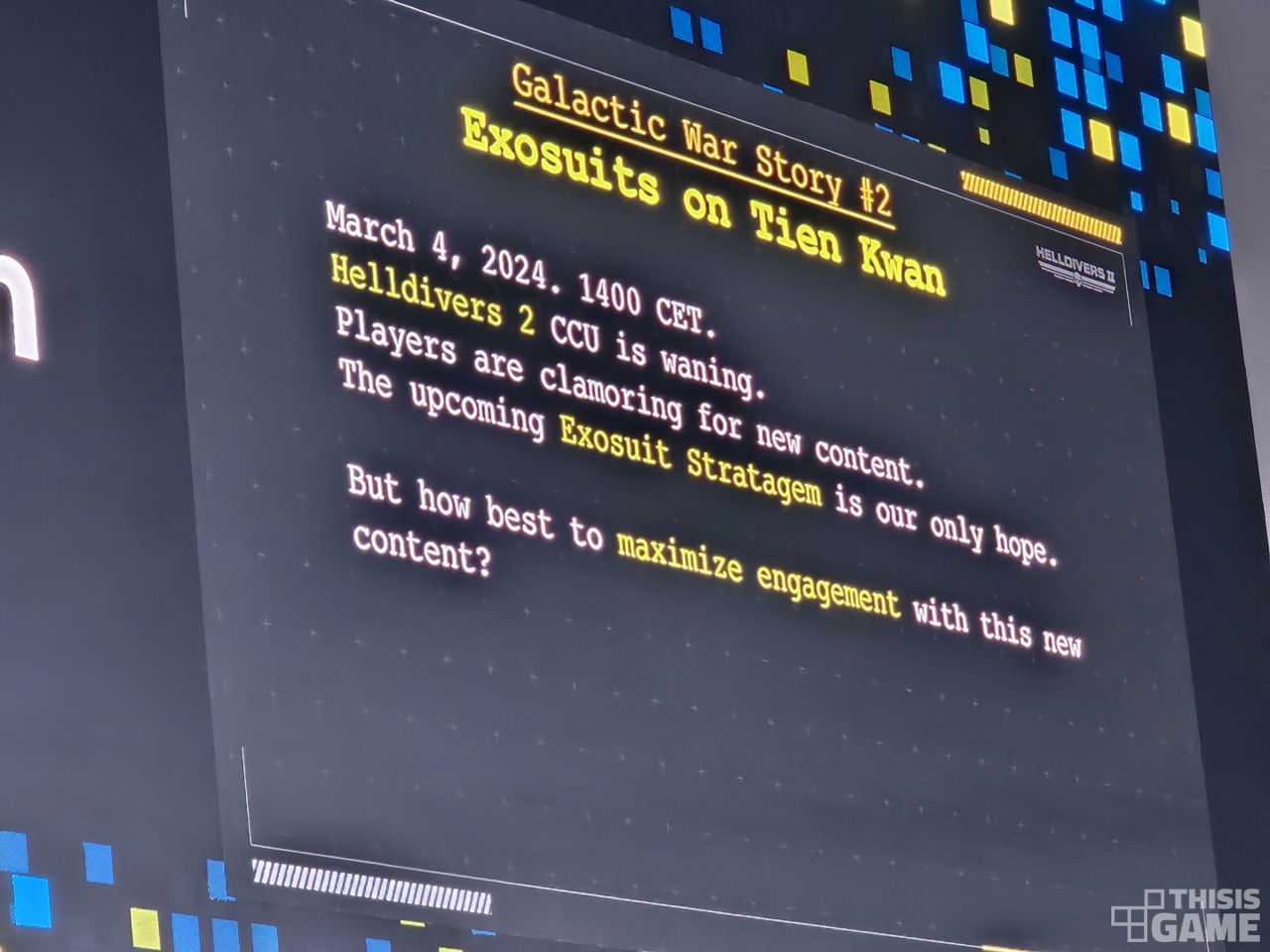 좋은 사례를 소개하자면 2024년 3월 진행된 엑소슈트 추가 이벤트가 있다. 당시는 <헬다이버즈 2>가 주요 업데이트 를 진행한 지 한 달이 지났고, 플레이어 지표가 감소하고 있었으며, 새로운 콘텐츠에 대한 요구가 빗발치는 시점이었다. 새롭게 추가될 엑소슈트 장비 추가 단 하나가 애로우헤드에게 분위기를 반전시킬 유일한 희망인 상황이었다.