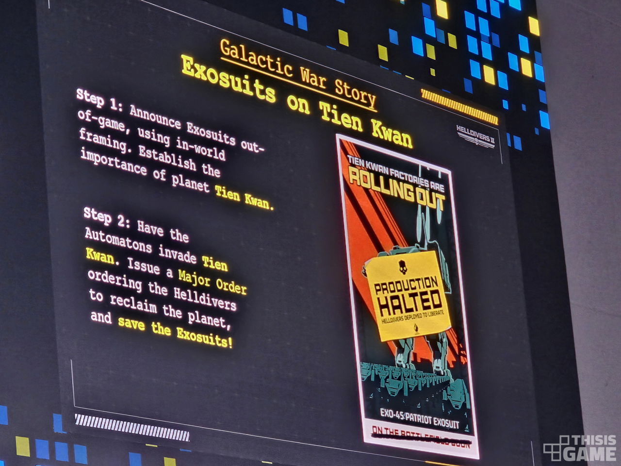 엑소슈트 추가 이벤트는 에로우헤드 스튜디오에게 큰 영감을 줬다. 콘텐츠를 업데이트하더라도 단순히 추가하기만 하는 것보단, 가능한 선에서 게임의 내러티브와 매우 밀접하게 결합할 필요가 있다는 것이다. 그래야 콘텐츠가 스토리를 구체적으로 만들어낼 수 있다.