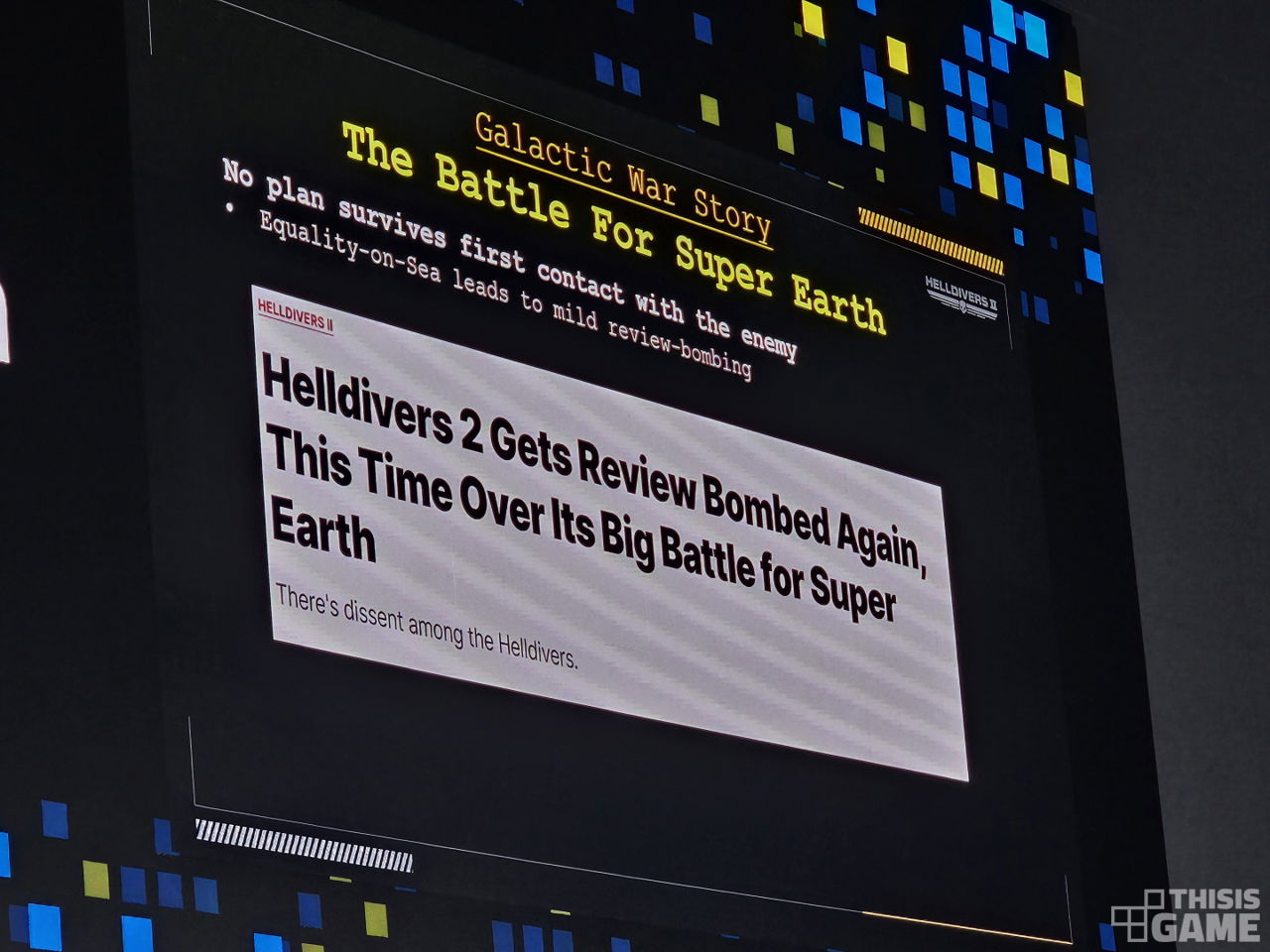 <헬다이버즈 2> 출시 1년 후, 업데이트된 핵심 콘텐츠는 ‘슈퍼 어스’ 방어전이다. 슈퍼 어스 방어전에서는 한 도시에 대한 방어전이 있었는데, 슈퍼 어스는 지구인 만큼 해당 도시의 위치는 상하이와 동일했다. 그렇다 보니 중국 커뮤니티에서의 호응이 컸고, 불가능한 상황에서도 방어전을 수없이 성공시키곤 했다. 얼마 지나지 않아 해당 콘텐츠에서 플레이어가 방어에 성공할 수 없도록 의도적으로 개발진이 개입하고 있다는 루머가 퍼져나갔고, 리뷰 테러가 발생했다.