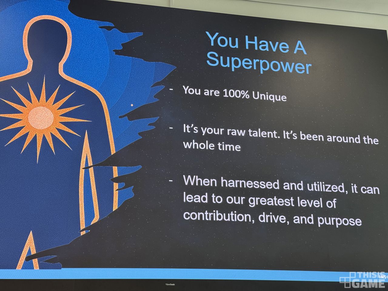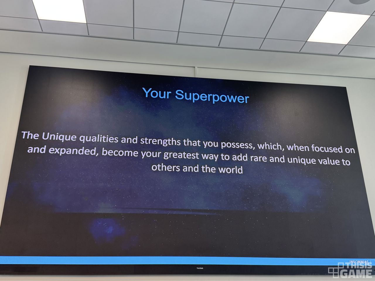 인섬니악 게임즈 대화 팀에서 활동 중인 매튜 스트라서(Matthew Strasser)는 이러한 질문에 답하기 위해 데브컴을 찾았다. 그는 "자기만의 초능력(Unique Superpower)"를 찾으라고 조언했다. "우리 각자 안에는 고유한 초능력이 존재한다. 강점, 재능, 본능이 독특하게 조합된 이 초능력은 제대로 활용할 때 기하급수적 성장을 가능하게 하는 기반이 된다"는 것이다.