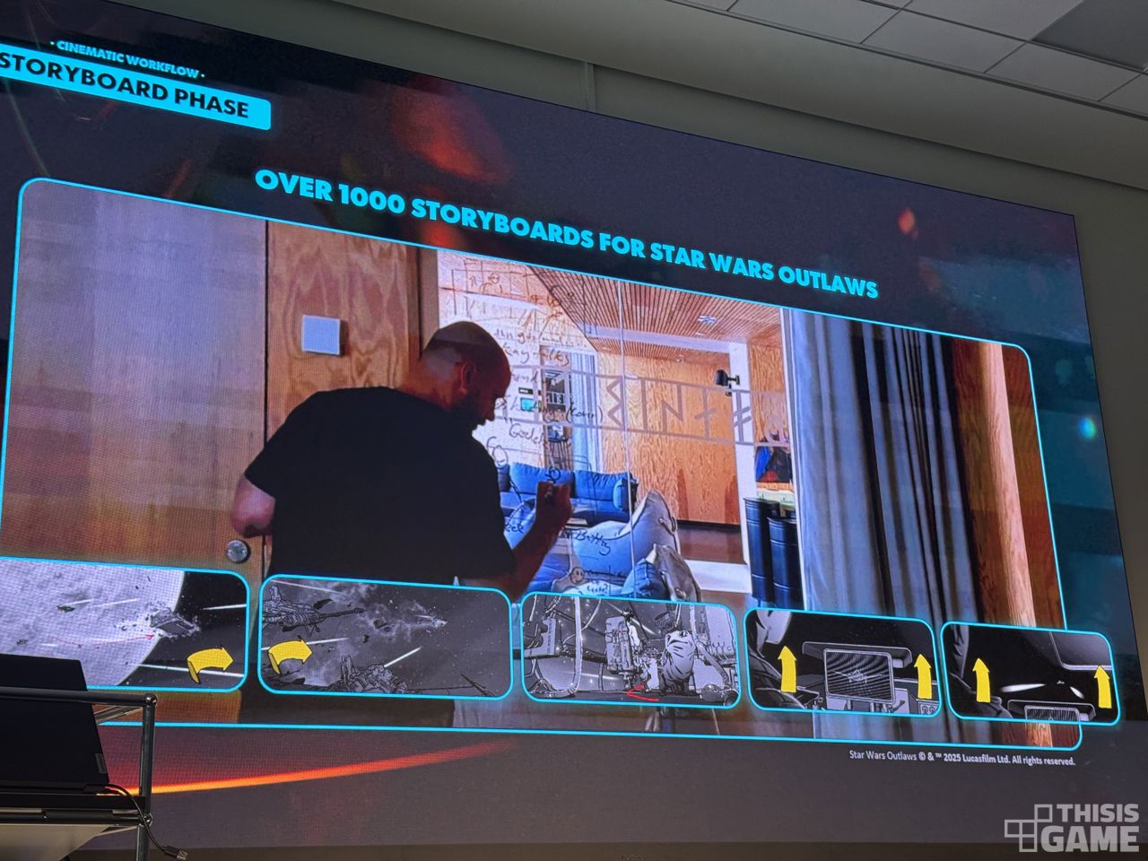 시네마틱 제작 과정은 대본, 스토리보드, 모션 캡처, 포스트 프로덕션의 순서로 진행됐다. 먼저 대본이 완성되면 스토리보드 작가들이 이를 시각화하는 작업을 시작한다. <스타워즈 아웃로>는 총 1,000개가 넘는 스토리보드가 제작됐으며, 이 중 80% 이상이 최종 게임에 그대로 반영될 만큼 높은 정확도를 자랑했다. 이는 사전 기획 단계에서 공들인 노력이 후반 작업의 효율성을 크게 높였다는 것을 보여준다.