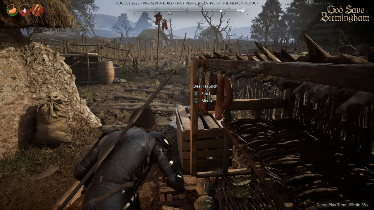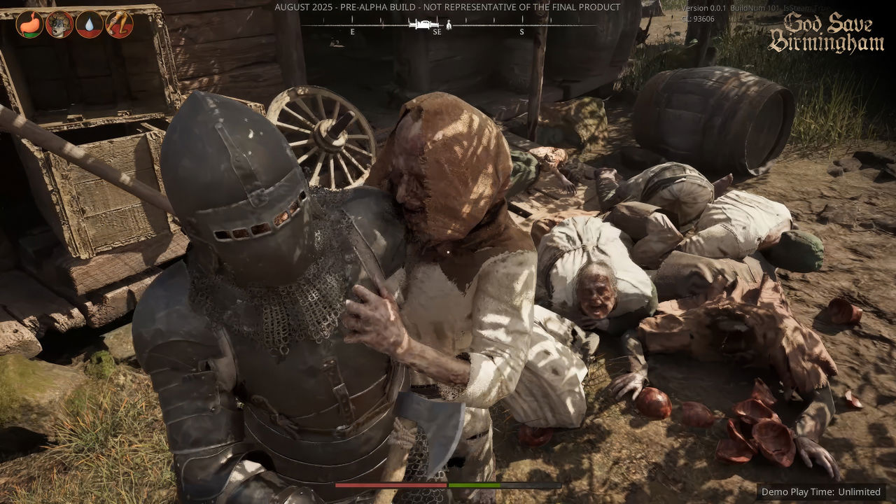 이유는 무엇일까? <갓 세이브 버밍엄>은 좀비가 등장하는 생존 시뮬레이션 게임이다. 중세 시대 영국의 실존하는 마을 '버잉엄'을 배경으로, 플레이어는 좀비떼 속에 고립된 농부가 되며 생존을 위해 고군분투해야 한다. 낮에는 좀비를 피해 건물을 뒤지며 기아로 쓰러지기 전에 썩지 않은 음식을 찾고, 좀비로 둘려쌓인 우물에 어떻게든 접근해 탈수로 쓰러지기 전에 물을 마시고, 밤에는 안전한 장소를 찾아 잠을 자야 한다.