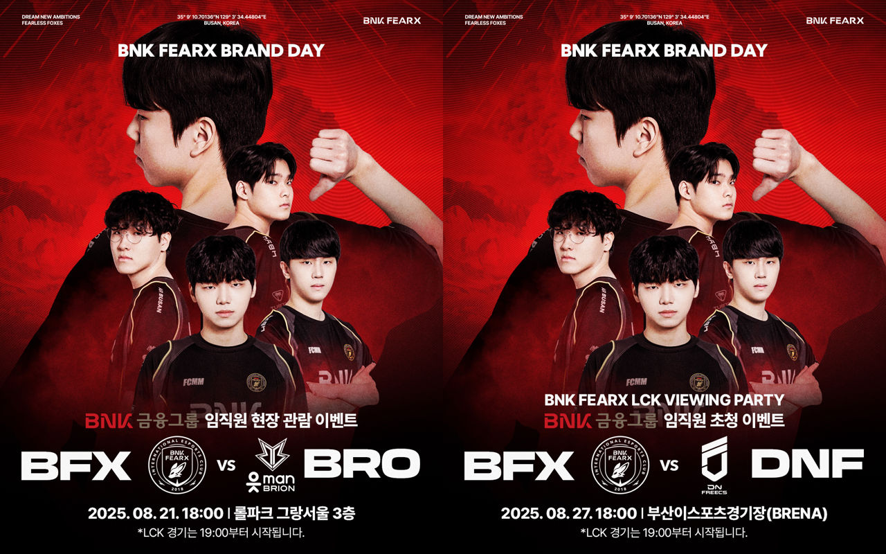 부산광역시를 대표하는 e스포츠팀 BNK 피어엑스(FEARX)는 오는 21일, 27일 각각 서울과 부산에서 BNK금융그룹(빈대인 회장) 임직원을 초청하여 BNK 브랜드데이를 진행한다고 오늘 밝혔다.